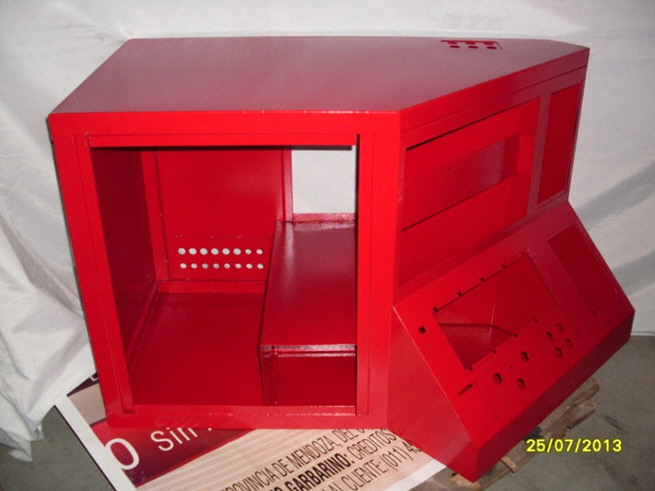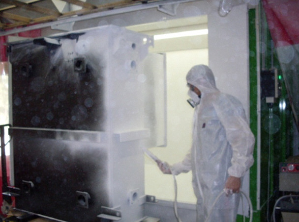 La aplicación de pintura en polvo requiere de una cabina especial en donde se realiza el pintado propiamente dicho, luego se necesita exponer la pieza a temperatura para que la pintura pueda convertirse y tomar la apariencia conocida.